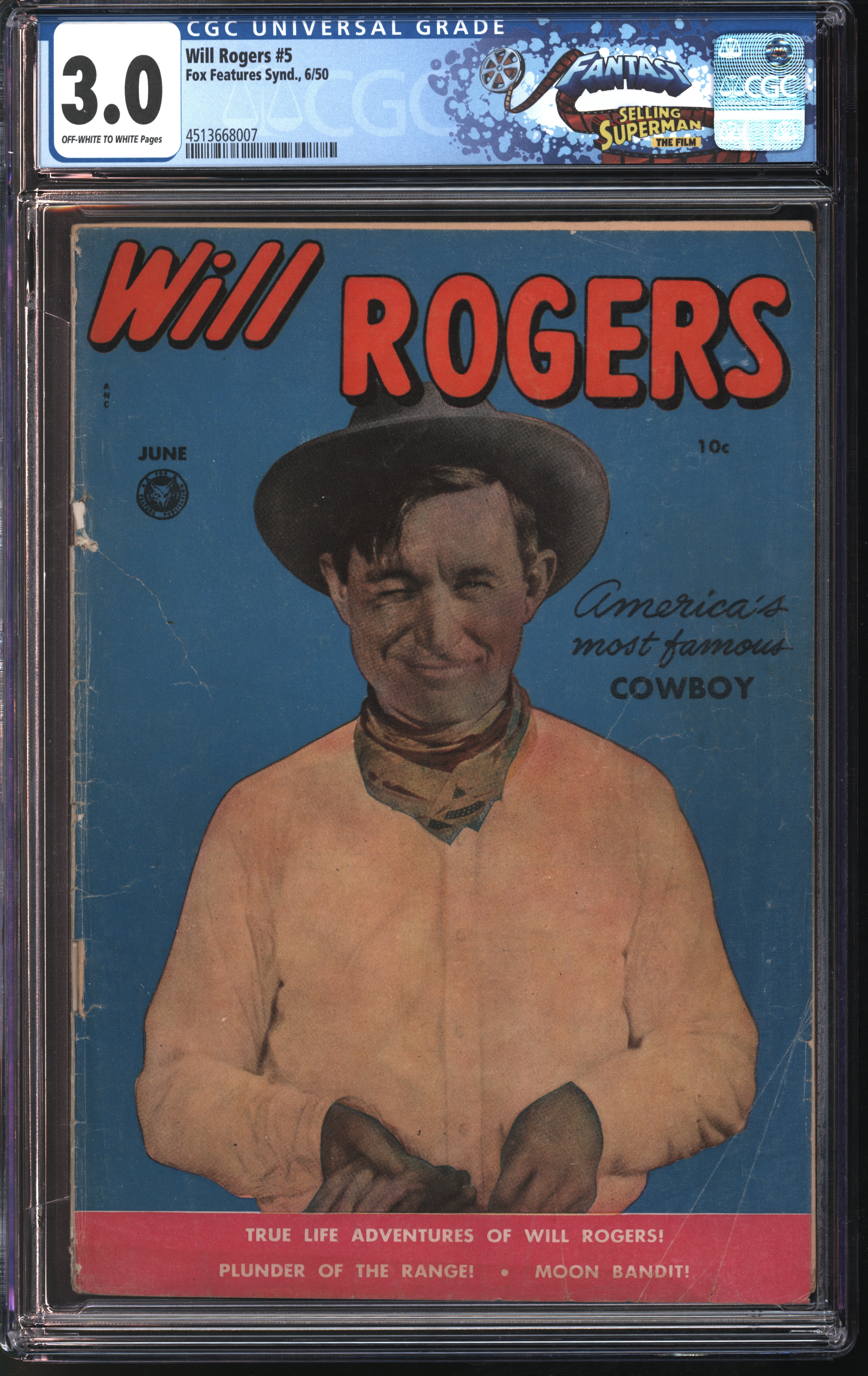 Fox Features Synd. Will Rogers #5 6/50 FANTAST CGC 3.0 Off-White to White Pages
