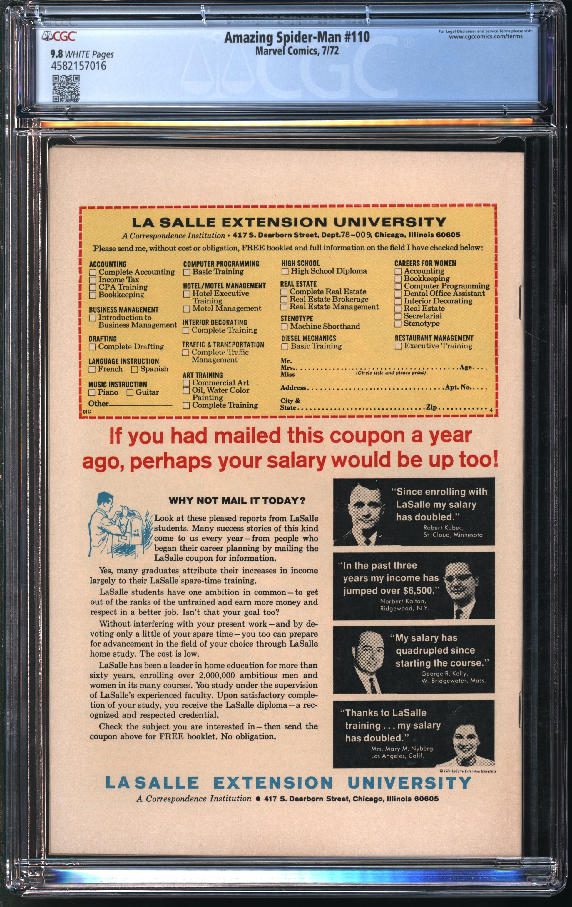Marvel Comics Amazing Spider-Man #110 7/72 CGC 9.8 White Pages